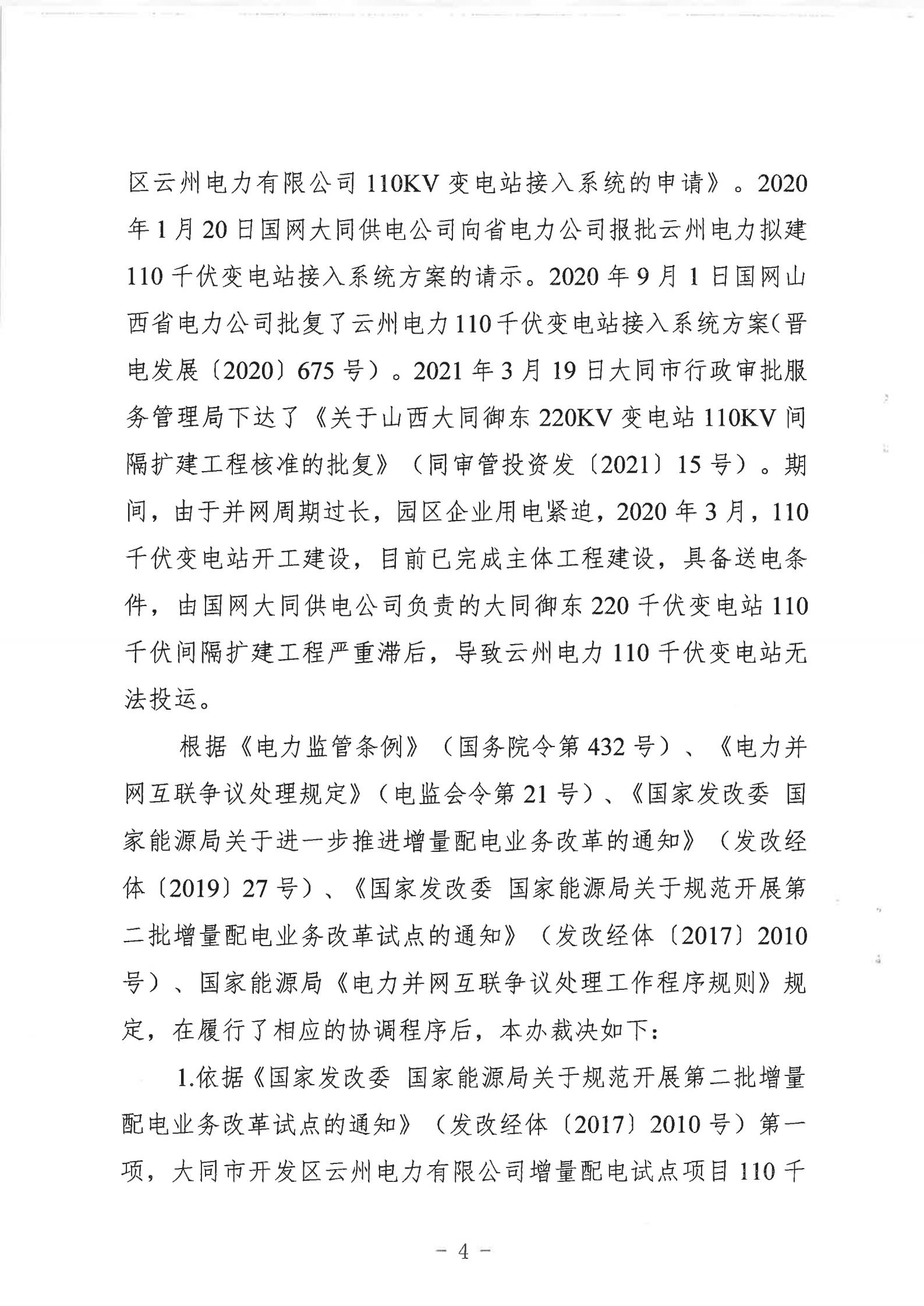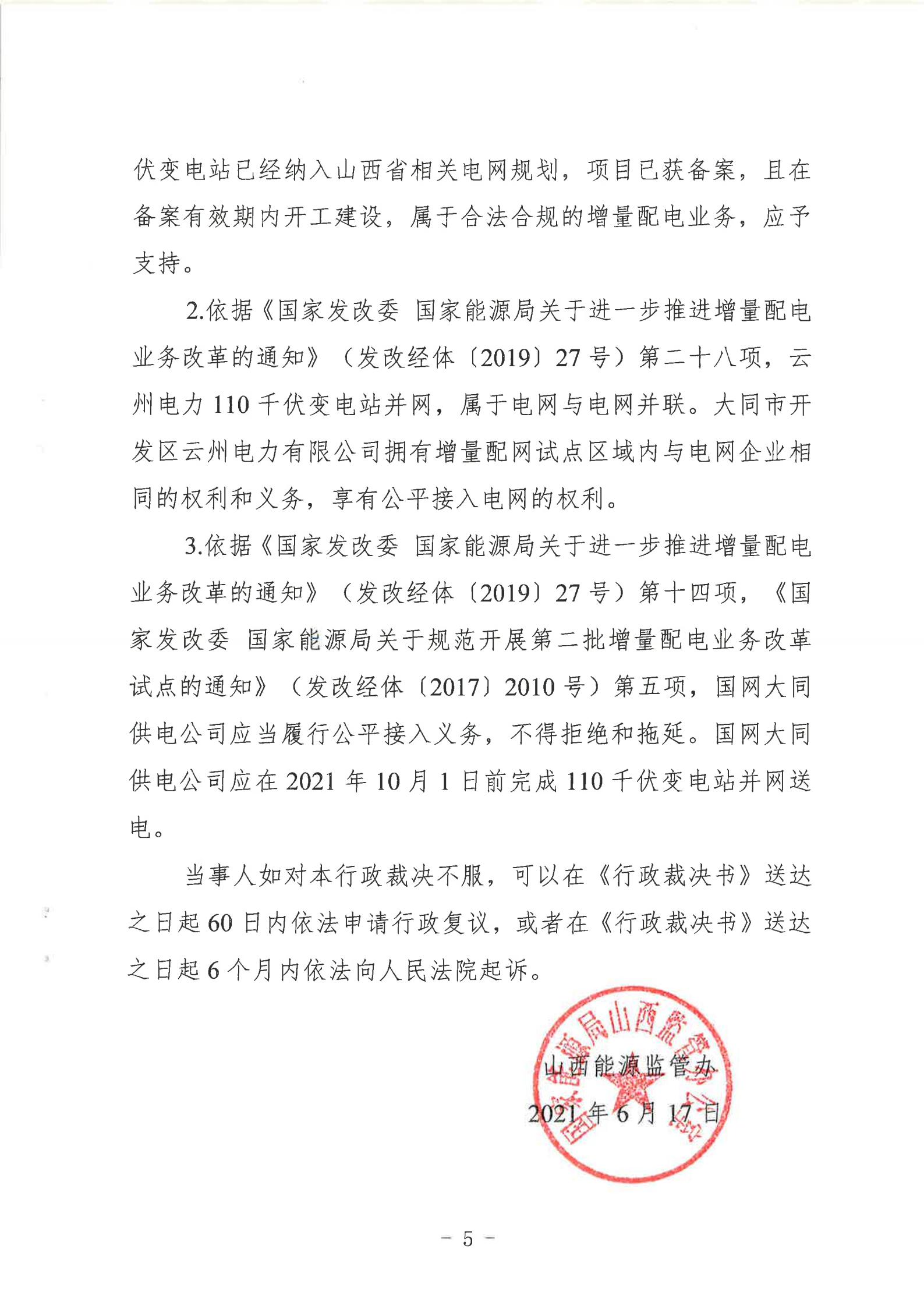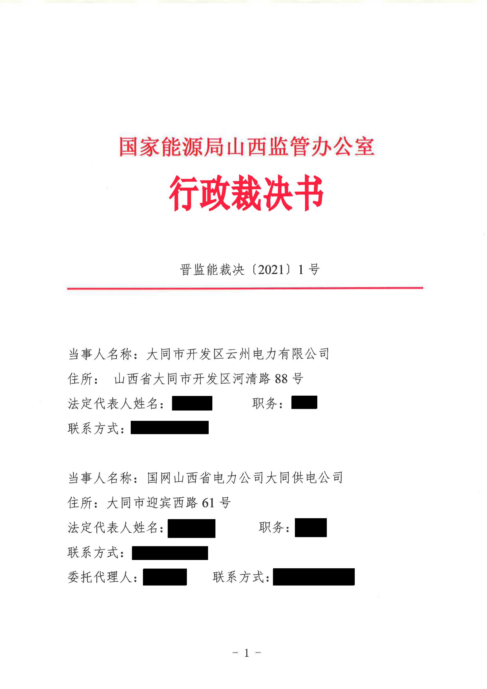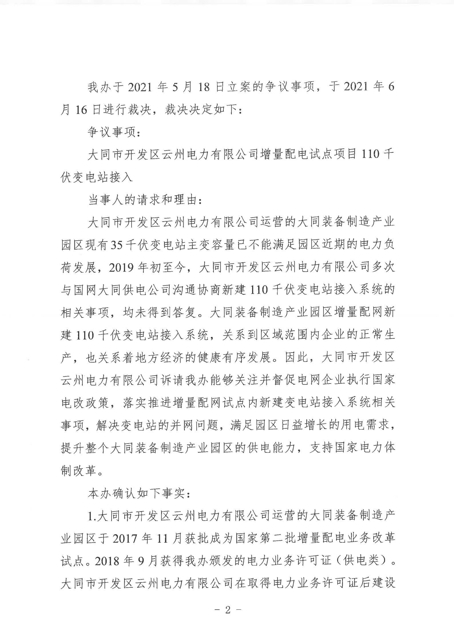 山西能監(jiān)辦近日發(fā)布行政裁決書(晉監(jiān)能裁決【2021】1號),裁決書顯示,山西能監(jiān)辦于2021年5月18日立案爭議事項,于2021年6月16日進行裁決。爭議事項為大同市開發(fā)區(qū)云州電力有限公增量配電試點項目110千伏變電站接入。 當(dāng)事人的請求和理由:大同市開發(fā)區(qū)云州電力有限公司運營的大同裝備制造產(chǎn)業(yè)園區(qū)現(xiàn)有35千伏變電站主變?nèi)萘恳巡荒軡M足園區(qū)近期的電力負(fù)荷發(fā)展,2019年初至今,大同市開發(fā)區(qū)云州電力有限公司多次與國網(wǎng)大同供電公司溝通協(xié)商新建110千伏變電站接入系統(tǒng)的相關(guān)事項,均未得到答復(fù)。大同市開發(fā)區(qū)云州電力有限公司訴請山西能監(jiān)辦能夠關(guān)注并督促電網(wǎng)企業(yè)執(zhí)行國家電改政策,落實推進增量配網(wǎng)試點內(nèi)新建變電站接入系統(tǒng)相關(guān)事項,解決變電站的并網(wǎng)問題,滿足園區(qū)日益增長的用電需求,提升整個大同裝備制造產(chǎn)業(yè)園區(qū)的供電能力。 山西能監(jiān)辦裁決: 大同市開發(fā)區(qū)云州電力有限公司增量配電試點項目110千伏變電站已經(jīng)納入山西省相關(guān)電網(wǎng)規(guī)劃,項目已獲備案,且在備案有效期內(nèi)開工建設(shè),屬于合法合規(guī)的增量配電業(yè)務(wù),應(yīng)予支持。 大同市開發(fā)區(qū)云州電力有限公司擁有增量配網(wǎng)試點區(qū)域內(nèi)與電網(wǎng)企業(yè)相同的權(quán)利與義務(wù),享有公平接入電網(wǎng)的權(quán)利。 國網(wǎng)大同供電公司應(yīng)當(dāng)履行公平接入義務(wù),不得拒絕和拖延。國網(wǎng)大同供電公司應(yīng)在2021年10月1日前完成110千伏變電站并網(wǎng)送電。 以下為原文: