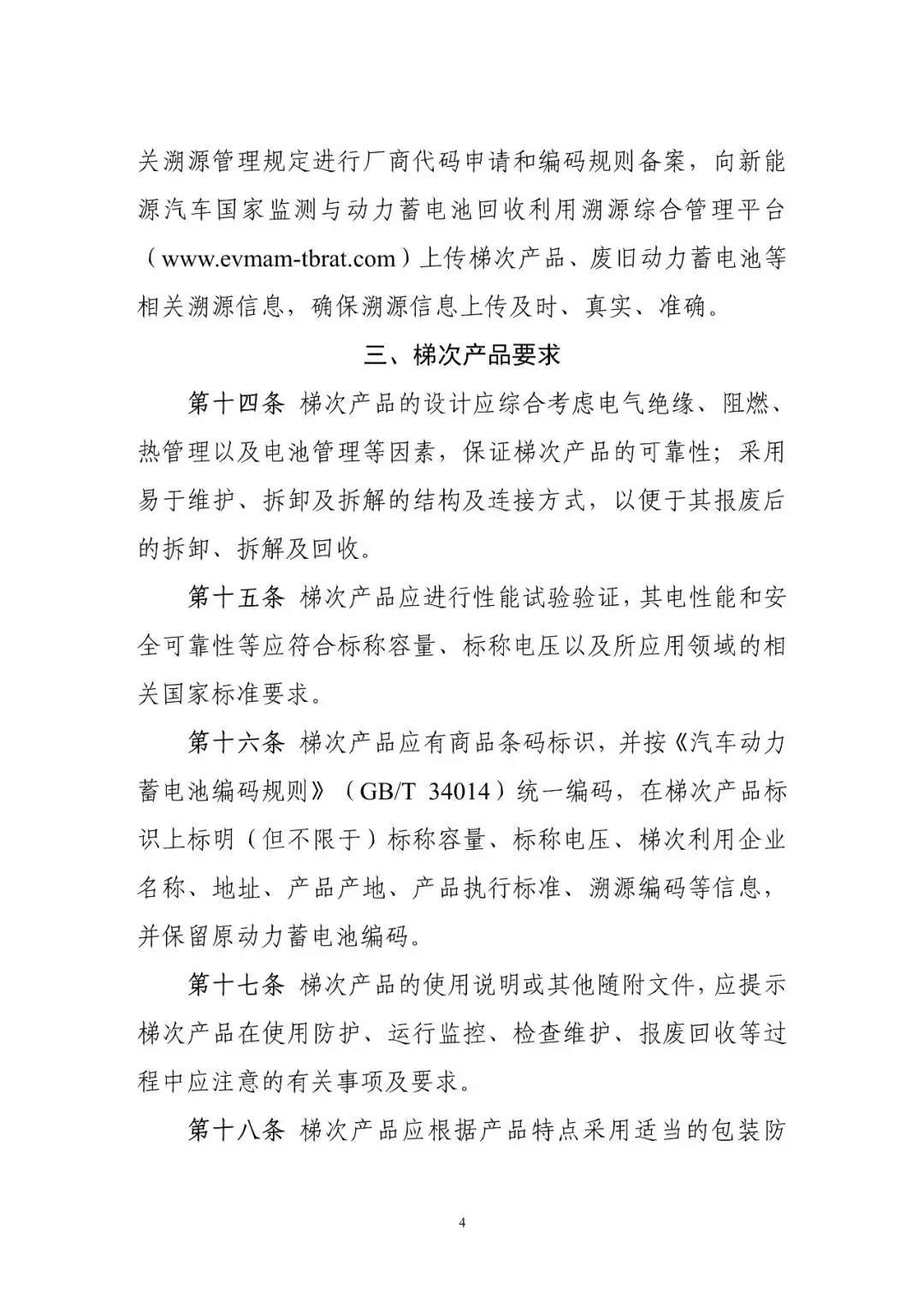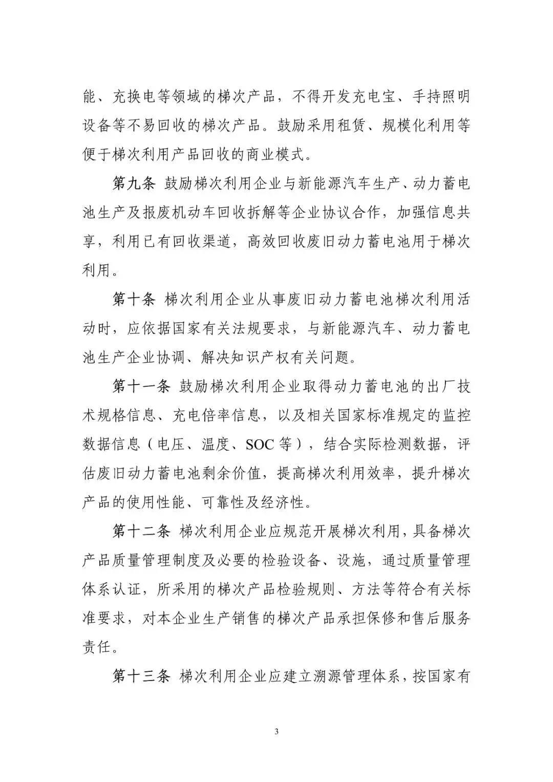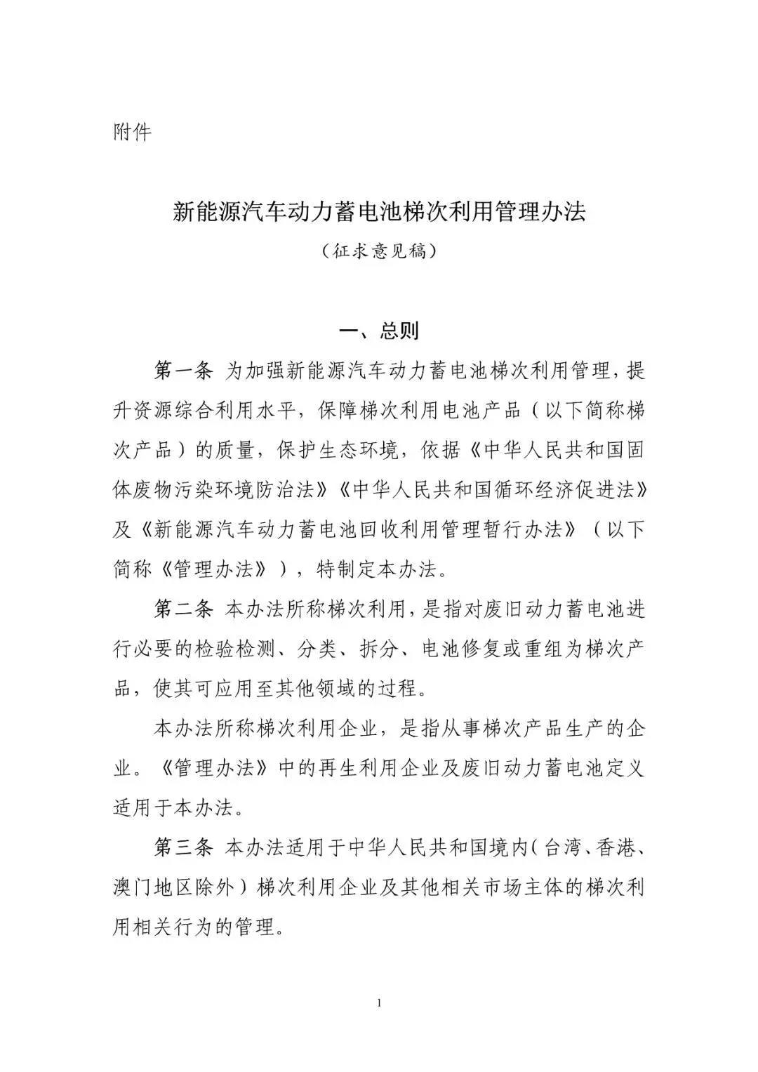 10月10日工信部開始就《新能源汽車動力蓄電池梯次利用管理辦法》公開征求意見,意見稿指出鼓勵梯次利用企業(yè)研發(fā)生產(chǎn)適用于基站備電、儲能、充換電等領(lǐng)域的梯次產(chǎn)品,鼓勵采用租賃、規(guī)模化應用等便于梯次利用產(chǎn)品回收的商業(yè)模式。鼓勵梯次利用企業(yè)取得動力電池的出廠技術(shù)規(guī)格信息、充電倍率信息,以及電壓、溫度、SOC等信息,評估廢舊動力電池剩余價值,提高梯次利用效率,提升產(chǎn)品的使用性能、可靠性及經(jīng)濟性。 文丨工信部 《新能源汽車動力蓄電池梯次利用管理辦法》公開征求意見 為加強新能源汽車動力蓄電池梯次利用管理,提升資源綜合利用水平,保障梯次利用電池產(chǎn)品的質(zhì)量,我們組織編制了《新能源汽車動力蓄電池梯次利用管理辦法》?,F(xiàn)將征求意見稿向社會公開征求意見,如有意見或建議,請于2020年11月8日前反饋工業(yè)和信息化部節(jié)能與綜合利用司。 聯(lián)系人及電話:艾崇 010-68205360 傳真:010-68205337 電子信箱:zyzhly@miit.gov.cn 附件:新能源汽車動力蓄電池梯次利用管理辦法(征求意見稿) 工業(yè)和信息化部節(jié)能與綜合利用司 2020年10月10日
