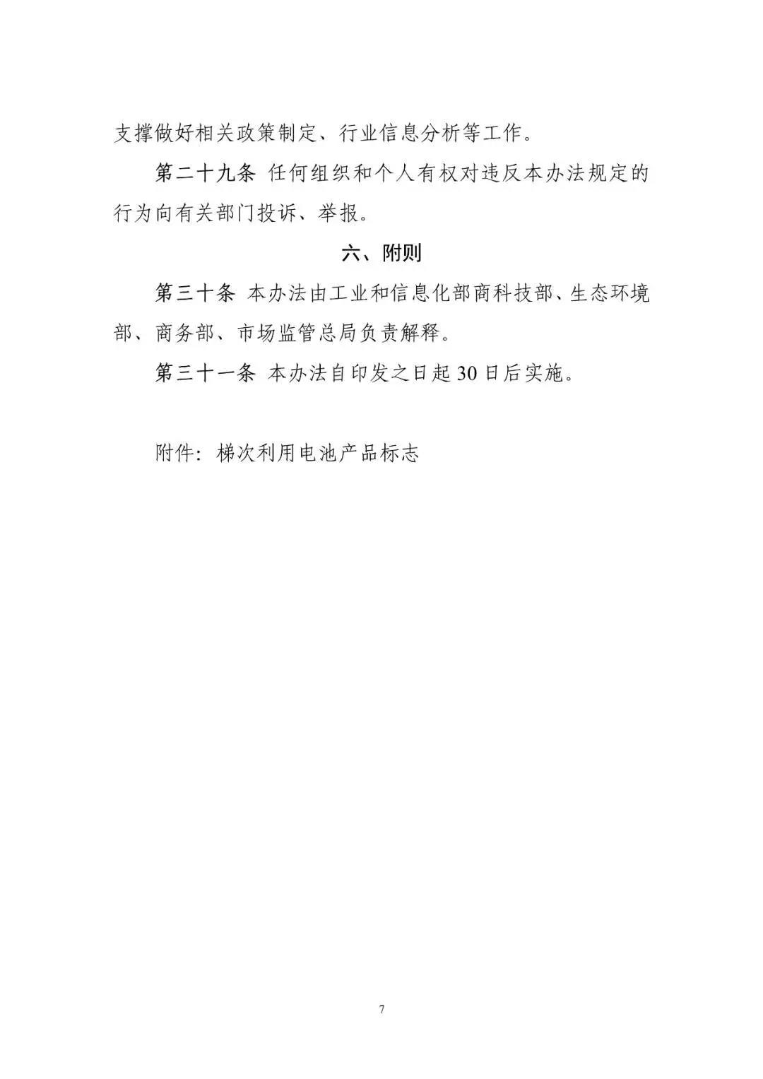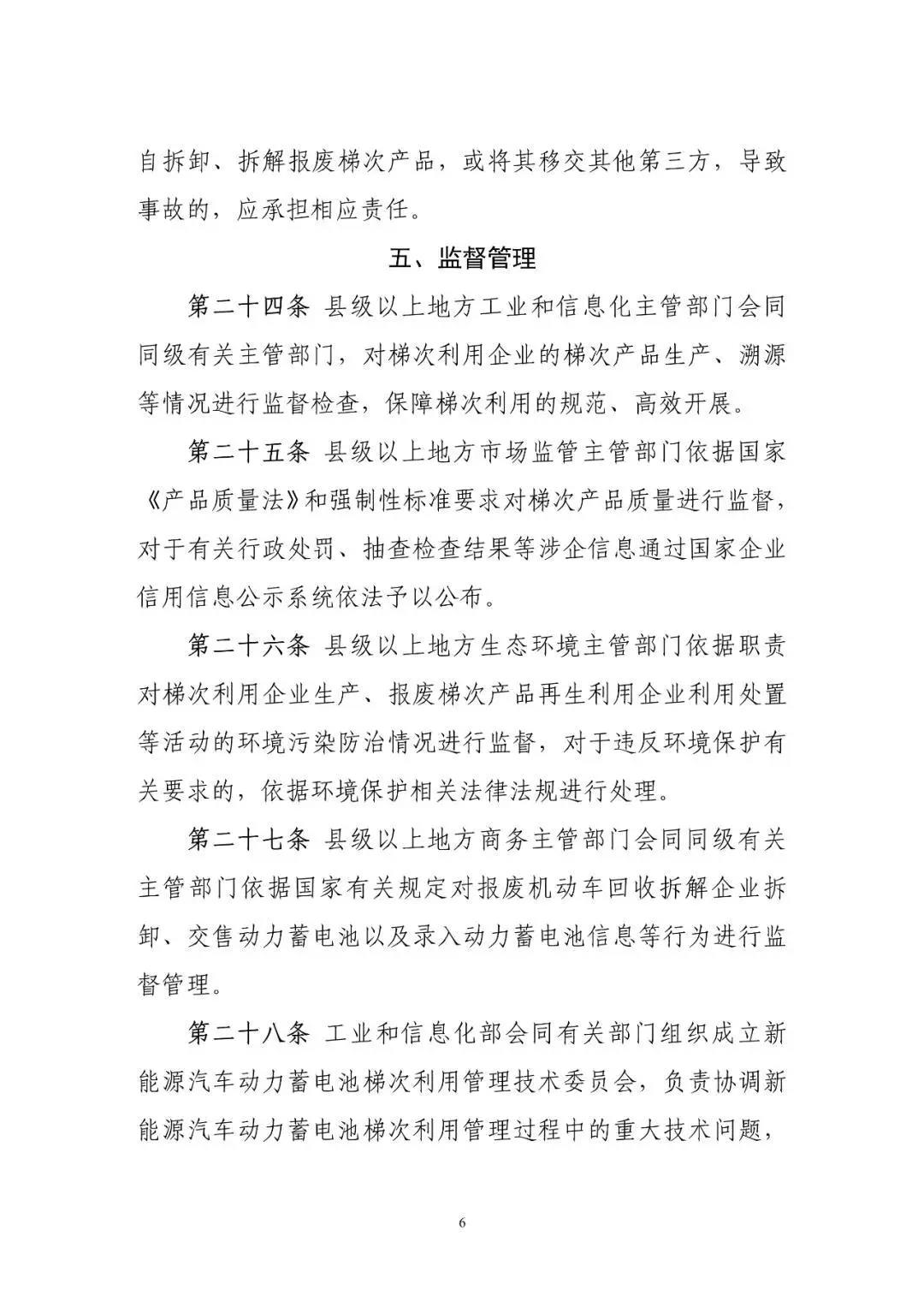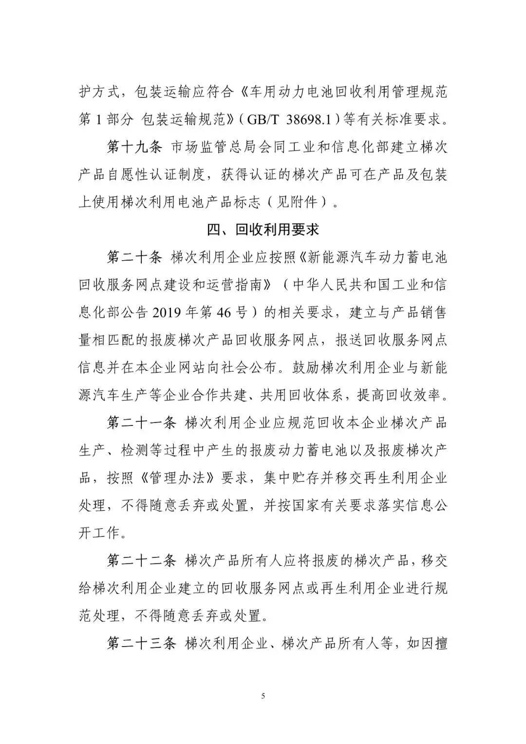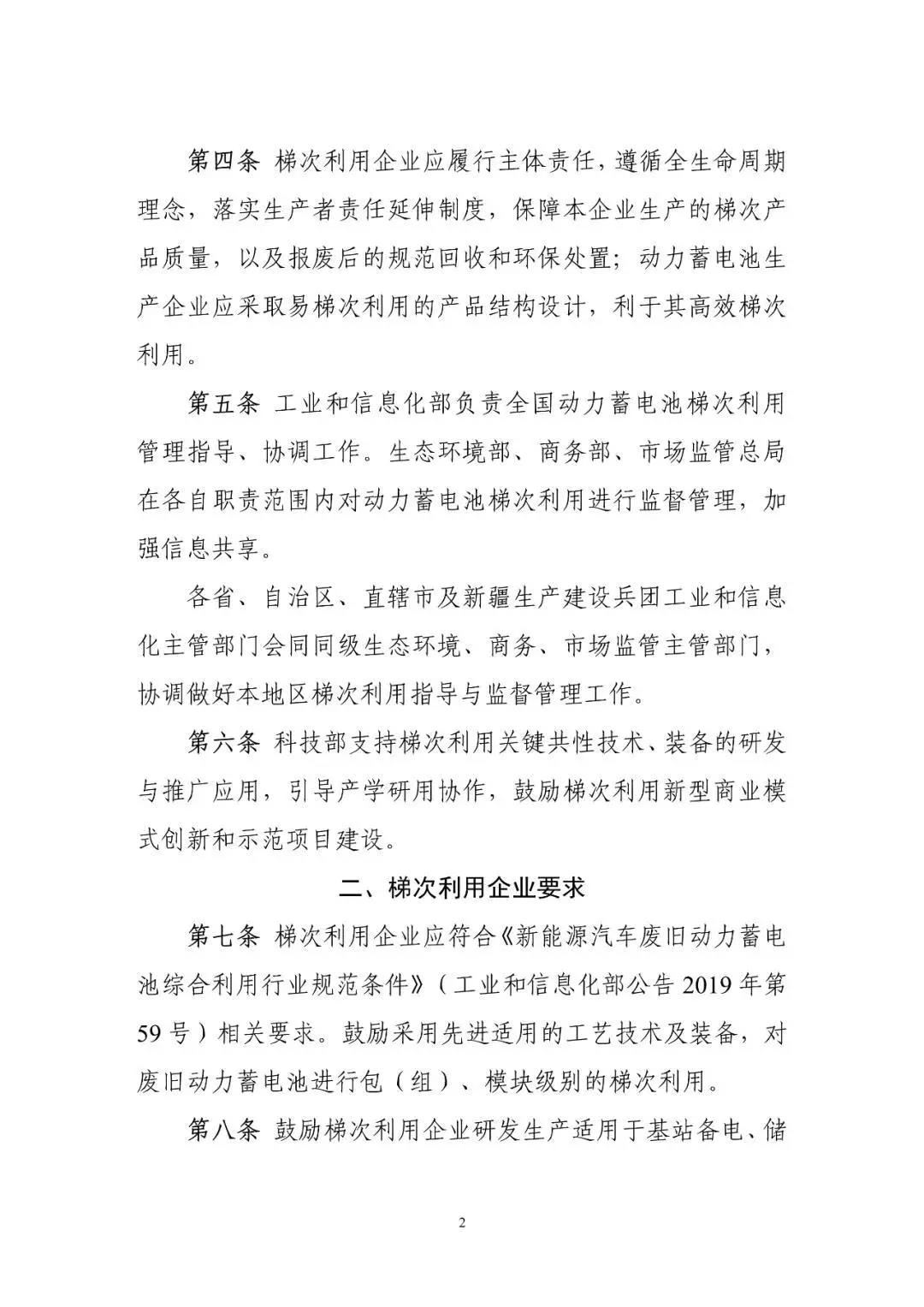 10月10日工信部開始就《新能源汽車動力蓄電池梯次利用管理辦法》公開征求意見,意見稿指出鼓勵梯次利用企業(yè)研發(fā)生產(chǎn)適用于基站備電、儲能、充換電等領(lǐng)域的梯次產(chǎn)品,鼓勵采用租賃、規(guī)模化應用等便于梯次利用產(chǎn)品回收的商業(yè)模式。鼓勵梯次利用企業(yè)取得動力電池的出廠技術(shù)規(guī)格信息、充電倍率信息,以及電壓、溫度、SOC等信息,評估廢舊動力電池剩余價值,提高梯次利用效率,提升產(chǎn)品的使用性能、可靠性及經(jīng)濟性。 文丨工信部 《新能源汽車動力蓄電池梯次利用管理辦法》公開征求意見 為加強新能源汽車動力蓄電池梯次利用管理,提升資源綜合利用水平,保障梯次利用電池產(chǎn)品的質(zhì)量,我們組織編制了《新能源汽車動力蓄電池梯次利用管理辦法》?,F(xiàn)將征求意見稿向社會公開征求意見,如有意見或建議,請于2020年11月8日前反饋工業(yè)和信息化部節(jié)能與綜合利用司。 聯(lián)系人及電話:艾崇 010-68205360 傳真:010-68205337 電子信箱:zyzhly@miit.gov.cn 附件:新能源汽車動力蓄電池梯次利用管理辦法(征求意見稿) 工業(yè)和信息化部節(jié)能與綜合利用司 2020年10月10日