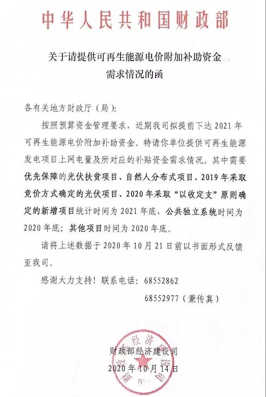 財(cái)政部下發(fā)了《關(guān)于請?zhí)峁┛稍偕茉措妰r(jià)附加補(bǔ)助資金需求情況的函》,擬提前下發(fā)2021年可再生能源電價(jià)附加補(bǔ)助資金。 通知明確表示,將優(yōu)先保障光伏扶貧項(xiàng)目、自然人分布式項(xiàng)目、2019年競價(jià)光伏項(xiàng)目、2020年“以收定支”新增項(xiàng)目。補(bǔ)貼時(shí)間截止為2021年底,公共獨(dú)立系統(tǒng)和其他項(xiàng)目的補(bǔ)貼截止時(shí)間為2020年底。 統(tǒng)計(jì)申報(bào)截止時(shí)間為2020年10月21日。