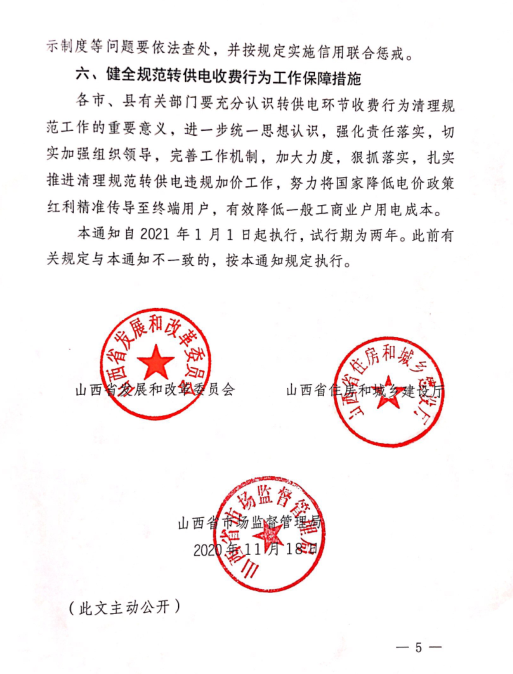 山西省發(fā)改委、住建廳、市場(chǎng)監(jiān)管局聯(lián)合印發(fā)通知,決定進(jìn)一步清理規(guī)范轉(zhuǎn)供電環(huán)節(jié)收費(fèi)行為,減輕企業(yè)負(fù)擔(dān)。2018年以來(lái),根據(jù)國(guó)家發(fā)改委統(tǒng)一部署,山西省價(jià)格主管部門(mén)共五次降低一般工商業(yè)電價(jià),累計(jì)降價(jià)金額每千瓦時(shí)13.26分。今年以來(lái),為應(yīng)對(duì)疫情影響,自2月1日起至12月31日,山西省降低除高耗能行業(yè)用戶外的現(xiàn)執(zhí)行一般工商業(yè)及其他電價(jià)、大工業(yè)電價(jià)的電力用戶電費(fèi),統(tǒng)一按原到戶電價(jià)水平的95%結(jié)算。 通知要求,各轉(zhuǎn)供電主體要嚴(yán)格按照國(guó)家和山西省出臺(tái)的電價(jià)降價(jià)及優(yōu)惠政策,開(kāi)展收取電費(fèi)行為的自查自糾。尚未將降價(jià)政策紅利傳導(dǎo)至終端用戶的,限于2020年12月31日前將降價(jià)政策紅利傳導(dǎo)至每一位終端用戶,不得截留。詳情如下: