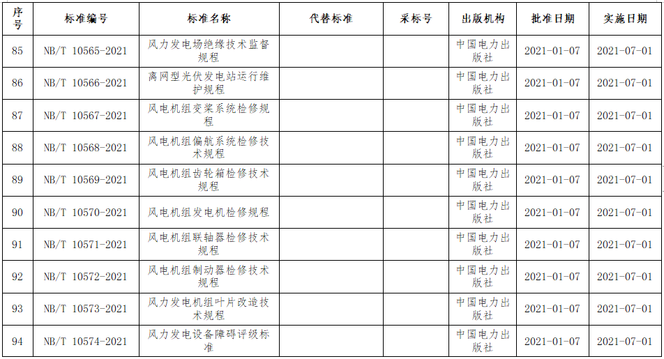 近日,國(guó)家能源局批準(zhǔn)《風(fēng)力發(fā)電場(chǎng)監(jiān)控自動(dòng)化技術(shù)監(jiān)督規(guī)程》、《風(fēng)力發(fā)電機(jī)葉片檢修規(guī)范》等113項(xiàng)能源行業(yè)標(biāo)準(zhǔn),其中涉及風(fēng)電標(biāo)準(zhǔn)37項(xiàng),2021年7月1日起實(shí)施。
